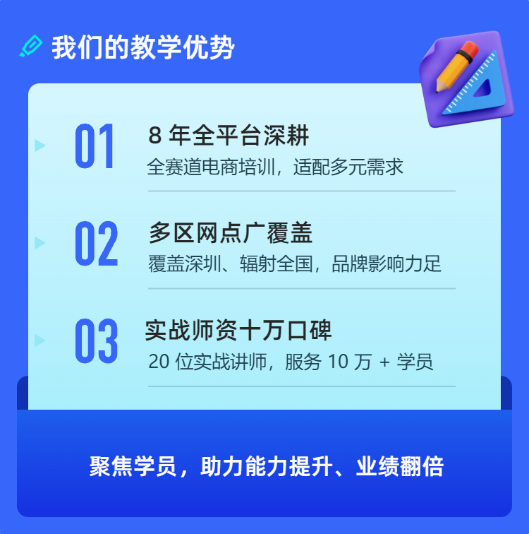创新教育培训机构,是一家专门从事电子商务培训教育的企业。机构专注电商领域8年,培训业务涉及淘宝、天猫、阿里巴巴、京东、拼多多、抖音短视频、直播电商、AI智能等领域平台。 联盟机构遍布龙华、坂田、观澜新田、平湖、石岩、坪洲等镇区,学员遍布珠三角地区及全国。2017年初已签约20位实战派讲师,线上和线下听课人数超过10万,创新已成为深圳优 秀的电商教育品牌。 我们的责任和使命是帮助100万电商奋斗者提升经营能力,实现网店业绩翻倍! 创新电商坚持:“以学员为中心,以人才与社会需求为导向,以贴心的服务取胜,以实战教学为根本,凭教学质量来发展”的经营理念;以人为本,注重学生的综合素质的提高,在短的时间内帮助多的人成功走向蓝领和白领。